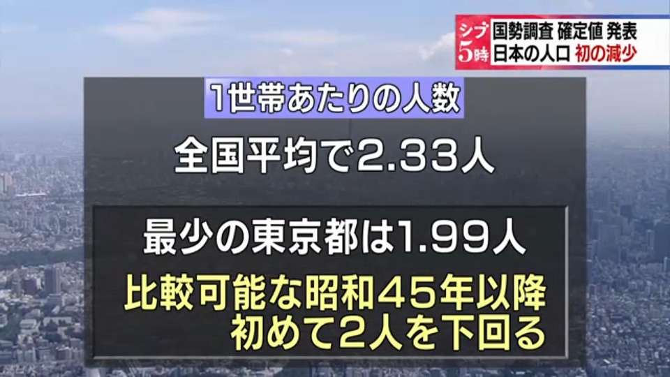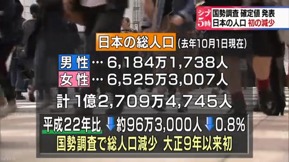ついに始まったか… 日本の総人口、初めて減少に転じる 前回調査と比べ96万3000人減る