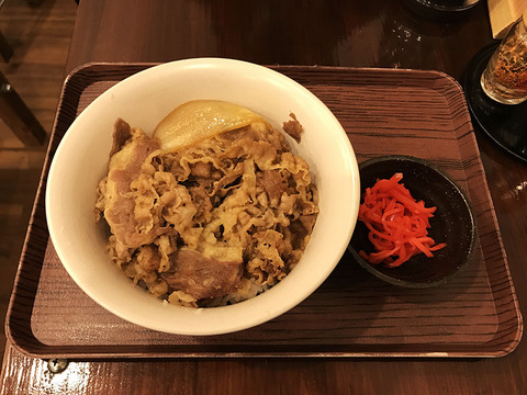 テーブルには紅生姜が置かれていないため、牛丼に別皿で紅生姜がついてくる。牛丼は肉が多く、タマネギは少なめだがやや大きく切られている感がある。さっそく肉をつまんで食べてみると……、ウホッ! これは確かにウマイ! 正直なところ、有名牛丼チェーン店に負けない美味しさである!・ヨクワカリマセン