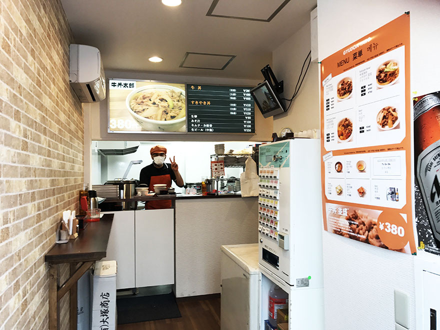 店頭のデザインはオレンジで統一されており「いかにも牛丼屋!」という雰囲気を醸している。店内に入ると券売機があり、食券を買ってカウンターで店員に渡し、2階の客席に移動して牛丼が運ばれてくるのを待つ。麦茶は飲み放題だがセルフサービスだ。・これは確かにウマイ!