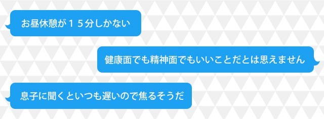 「育ち盛りに昼食時間が15分というのは健康面でも精神面でもいいことだとは思えません」といった声のほか、「息子に聞くと、15分たったら『ごちそうさまでした』とみんなは言うが、自分はいつも遅いので焦るそうだ」と、中学生の子どもを持つ保護者からの声も。