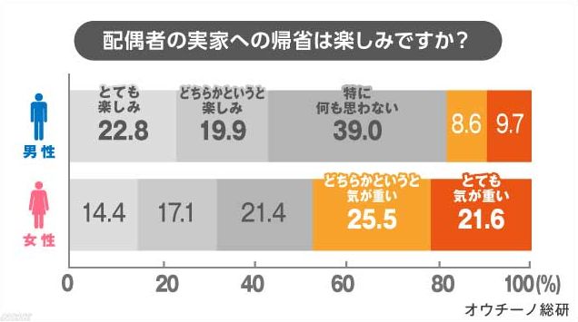 アンケートを実施したオウチーノ総研の池田汐里さんは、「夫は義理の実家に行っても特に気を遣わずに過ごす一方で、妻は義理の実家でいろいろと気を遣います。結果として『気が重い』と感じる結果となっている実態がわかります。夫婦で、帰省の受け止め方に大きく差があるので、自分の感覚で義理の実家への帰省をとらえてしまうと、帰省をきっかけに夫婦げんかにつながるおそれもあり、注意が必要ですね」と話しています。